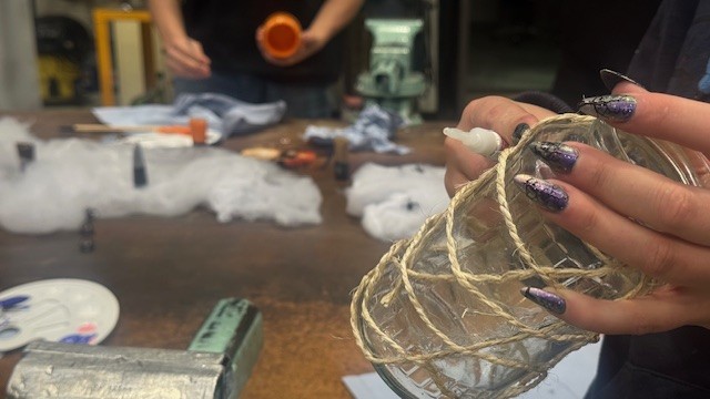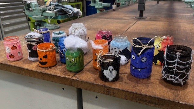 Am Ende hatten wir eine ganze Sammlung bunter, leuchtender Gläser, die jetzt in unserer Kantine stehen und für gemütlich-gruselige Stimmung sorgen.