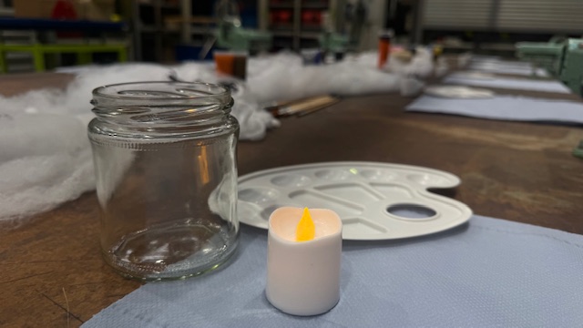 Deshalb haben wir uns überlegt, mal wieder etwas Kreatives zu machen. Wir haben Einmachgläser mitgebracht und daraus Halloween-Lichter gebastelt.